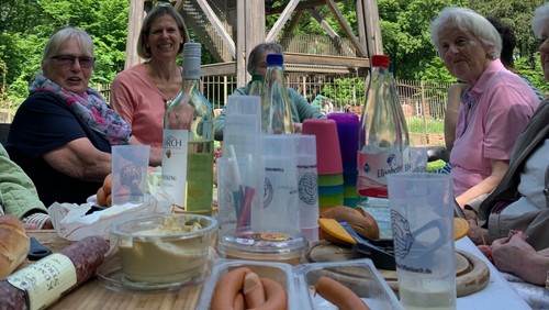 Jahr für Jahr ziehen wir an Himmelfahrt dahin, wo man hoch hinauskommt. Auf einen Berg steigen wie die Jünger können wir nicht; der Taunus, Spessart und Odenwald sind zu weit weg. Aber wir können auf den Goetheturm klettern und an seinem Fuß picknicken. Wie kommen wir hin: Wer laufen will, läuft. Familien mit kleinen Kindern nehmen das Rad. Unsere Seniorinnen verabreden sich zu Fahrgemeinschaften mit dem Auto. Start: Nach dem Gottesdienst